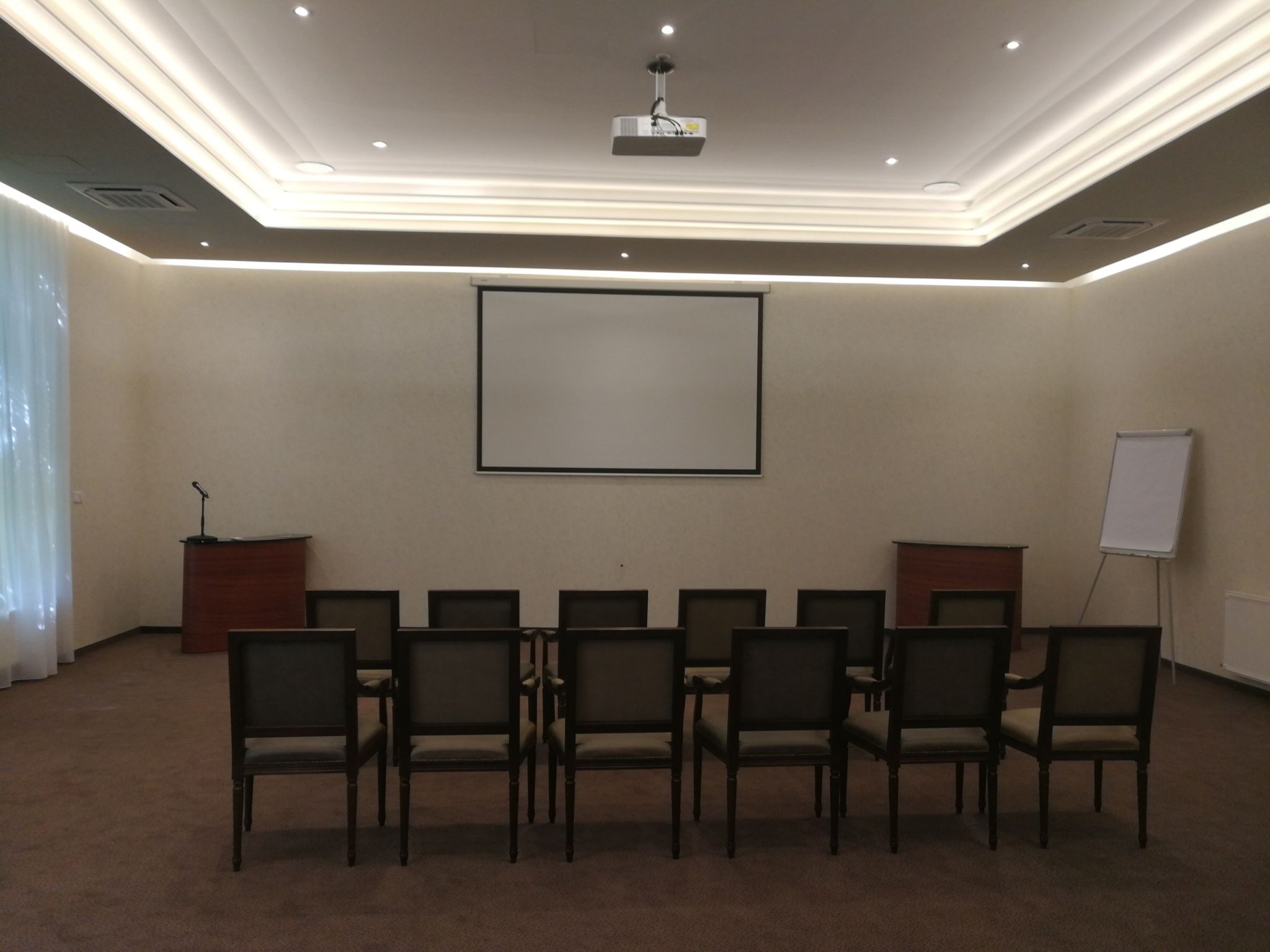 A konferenciaterem, mely klímával felszerelt, alkalmas céges rendezvények lebonyolítására: meeting, workshop, konferencia, tréning.