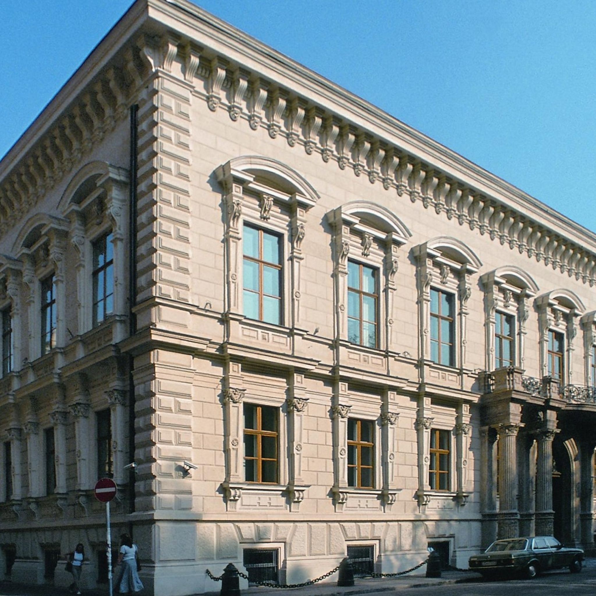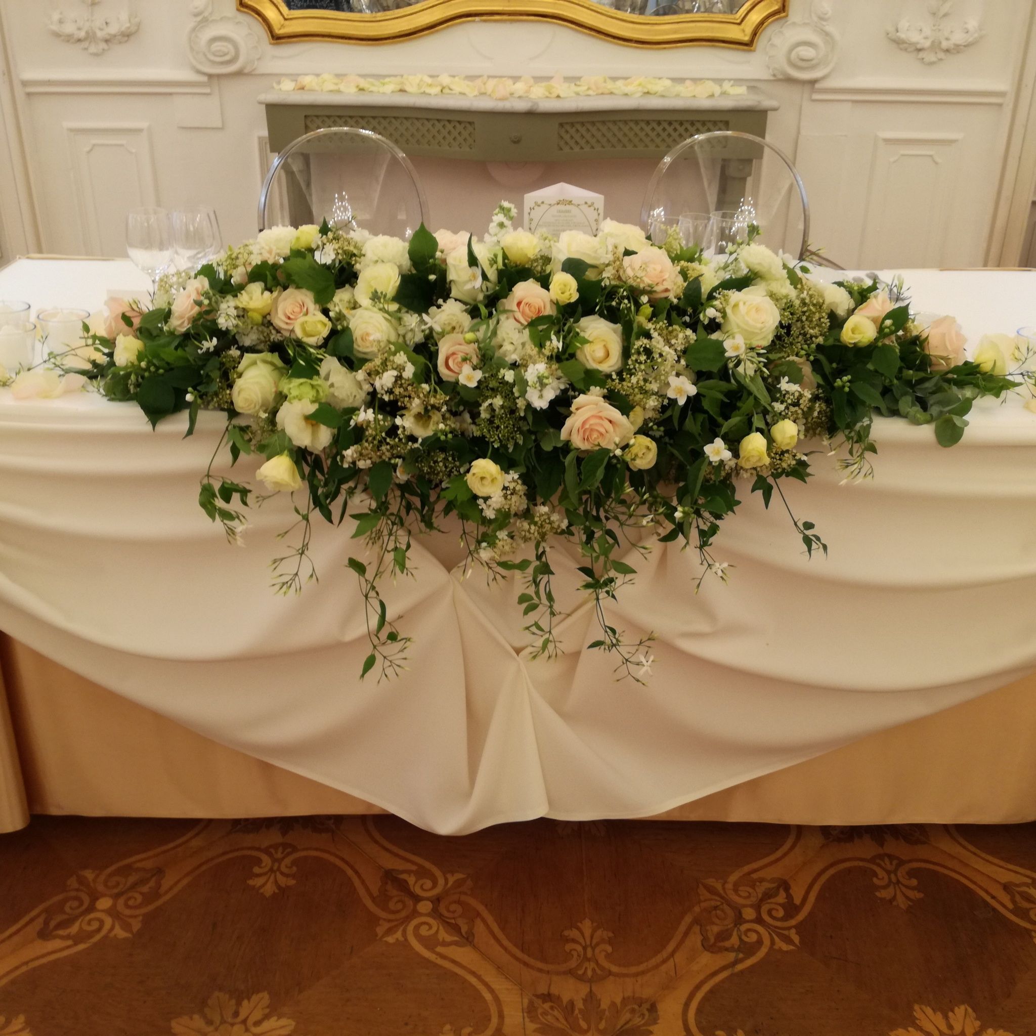 This banquet hall, which is adorned with inlaid parquet flooring, Venetian mirrors, and crystal chandeliers, is the gem of the building. The Hall of Mirrors can be accessed through the Marble Hall, consequently these two halls may only be rented together.
