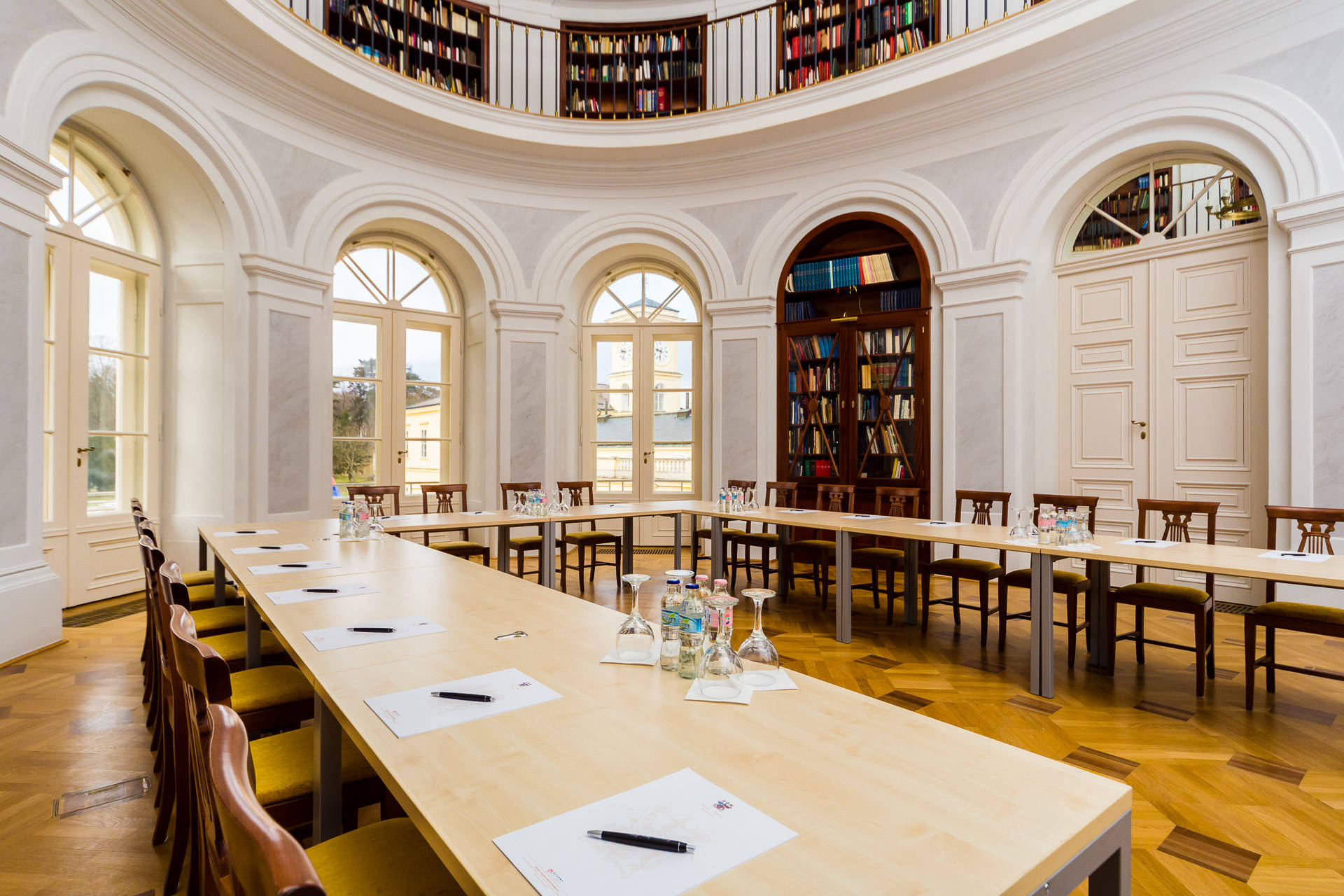 The building now consists of twenty bedrooms, several libraries richly stocked with books on the social sciences, eight meeting and conference rooms, of different sizes and fully equipped, a 500 sq.metre baroque cellar, and a restaurant seating eighty people.