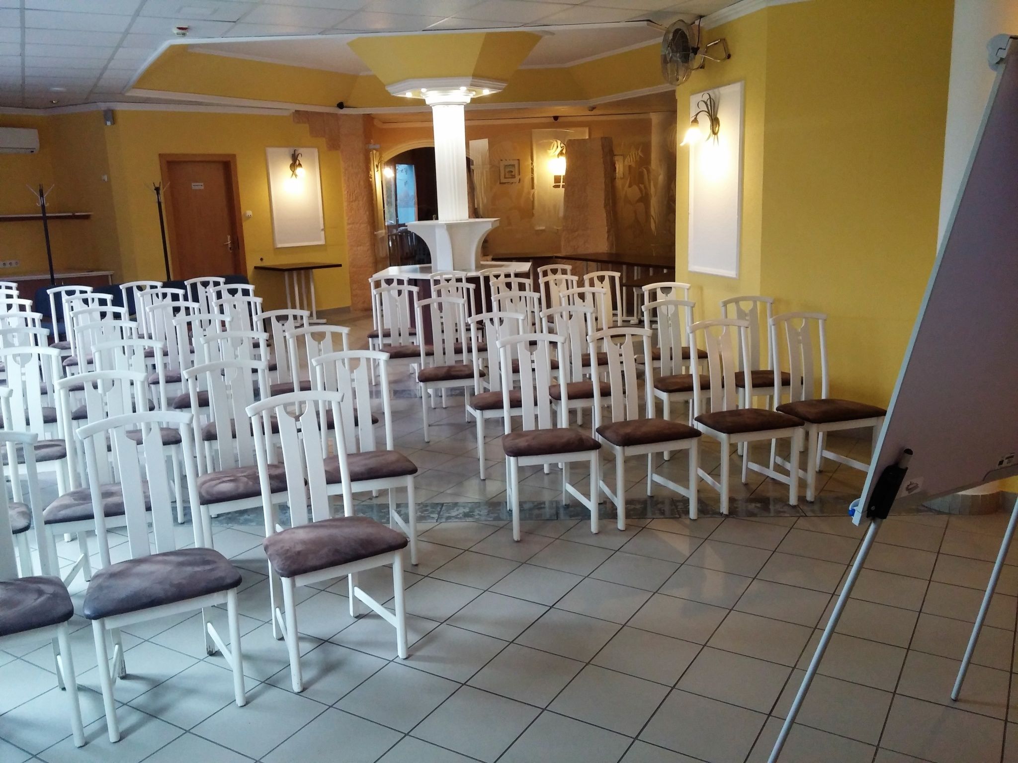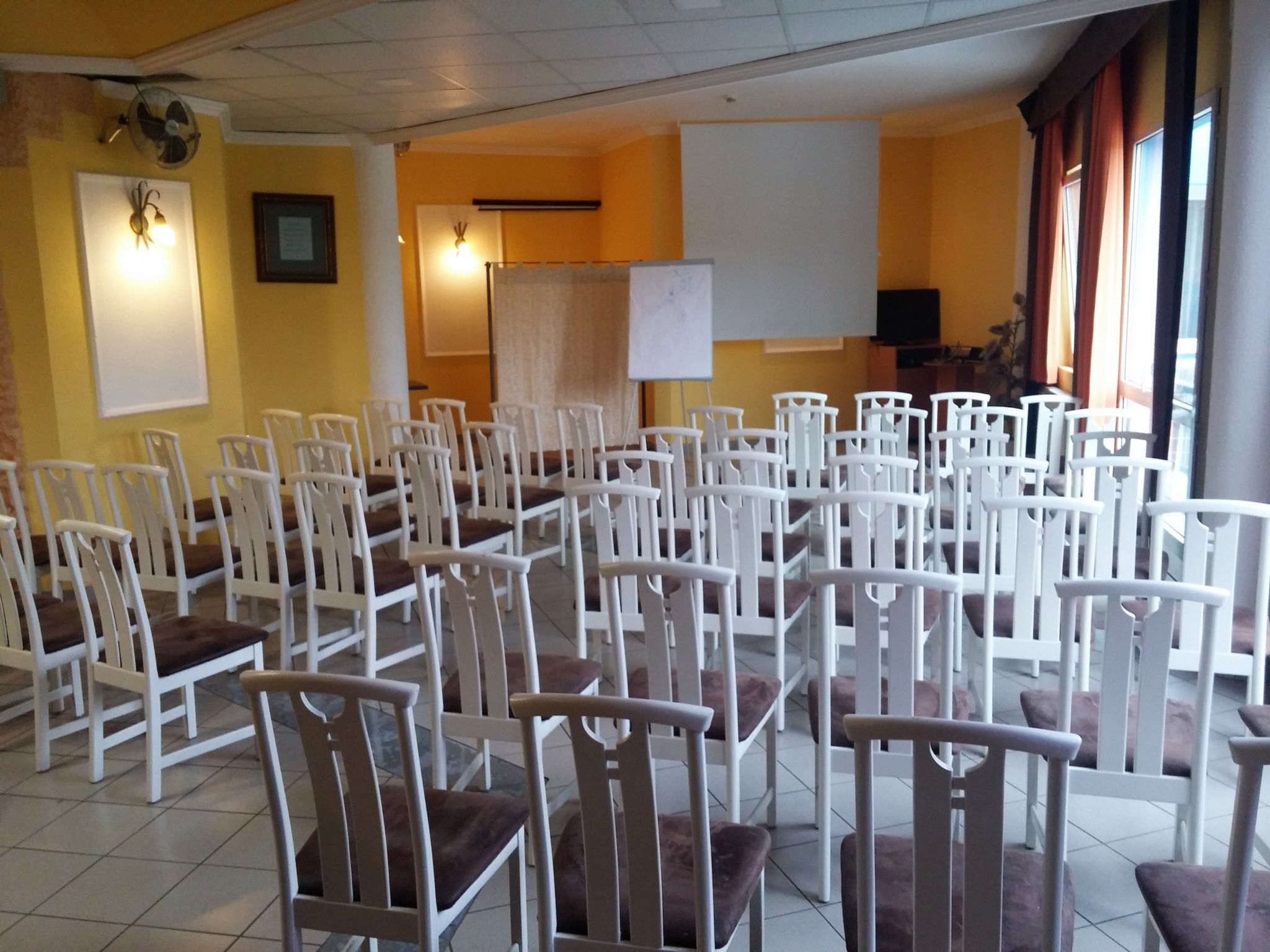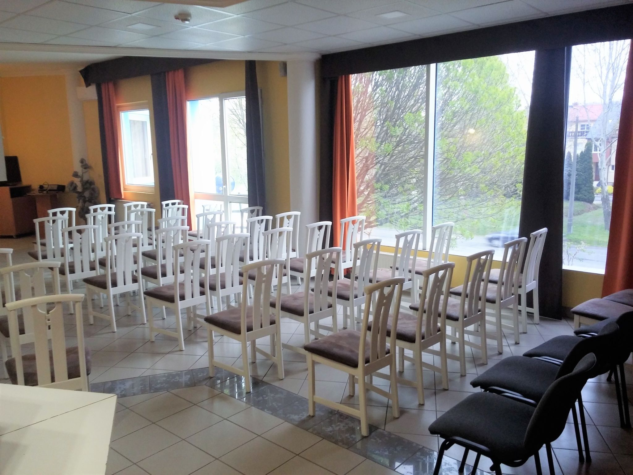 A konferenciaterem, mely természetes fényű, 50 fő befogadóképes, sötétíthető kiváló helyszín: termékbemutatóknak, csapatépítő tréningeknek, kötetlen meetingeknek, oktatásoknak.