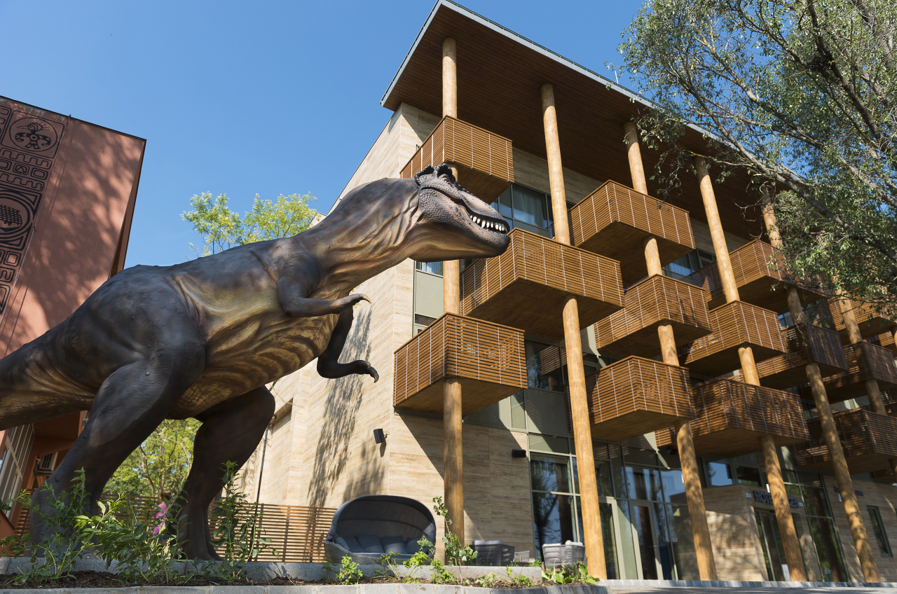 A belvárosból autóval alig tíz perc alatt érhető el, Sóstó partján, mi több, a 35 hektáron elterülő Nyíregyházi Állatpark területén helyezkedik el. A Föld történetének mérföldköveit bemutató szálloda mind a 38 szobájának kialakítását és berendezését más-más állat inspirálta.